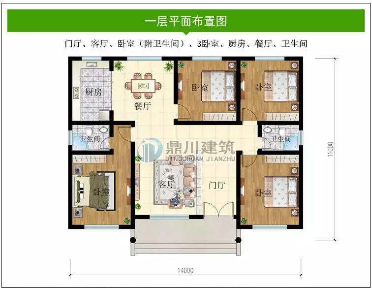 一 層:門廳、客廳、臥室(附衛生間)、3臥室、廚房、餐廳、衛生間