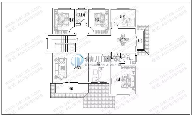 二 層:起居室、娛樂室(附露臺)、臥室(附書房,陽臺,衛生間)、3臥室、衛生間