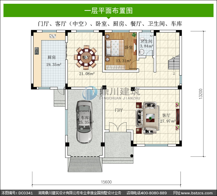 一 層: | 門廳、客廳(中空)、臥室、廚房、餐廳、衛生間、車庫 | |||